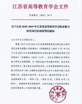 江苏省高等教育学会职业能力研究会和JYPC考试认证中心组织开展了结项管理工作,经组织专家评审、社会公示,确定获奖项目42项,包括特等奖3项、一等奖7项、二等奖14项、三等奖18项