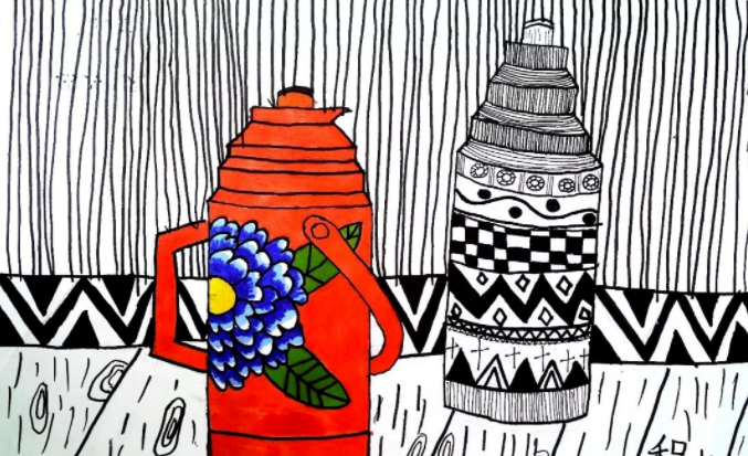 大轮廓画好后,刻画细节,填充各种基本线条和各种图案,也可以进行黑白处理。填充线条时要根据物体的质感、肌理和色彩应用线条的粗细、疏密、方向、形状的变化来表现。